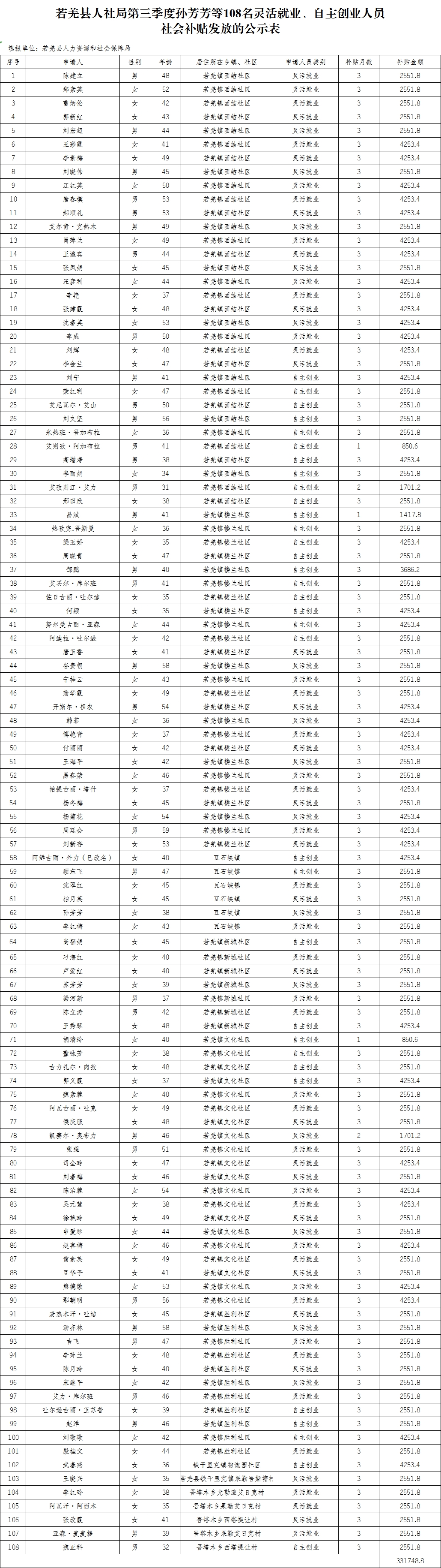 附件:若羌县人社局第三季度孙芳芳等108名灵活就业、自主创业人员社会保险发放的公示表