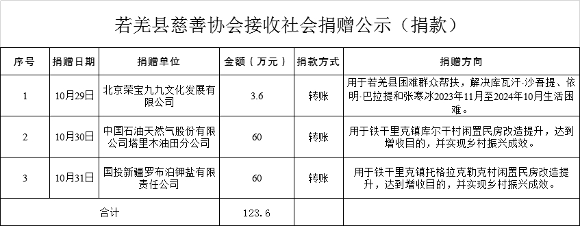 2023年10月29日-11月16日,若羌县慈善协会累计接收社会捐款123.6万元,所接收捐赠属于定向捐赠,按照捐赠协议执行,现将社会捐赠公示如下: