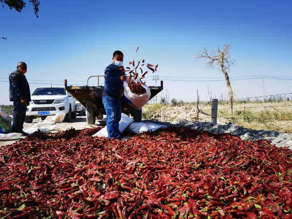 眼下正值辣椒的采收时节,若羌县瓦石峡镇金胡杨村随处可见采摘、装运辣椒的火热场景。晾晒场上,红彤彤的辣椒铺满一地,处处是一片红色的海洋。