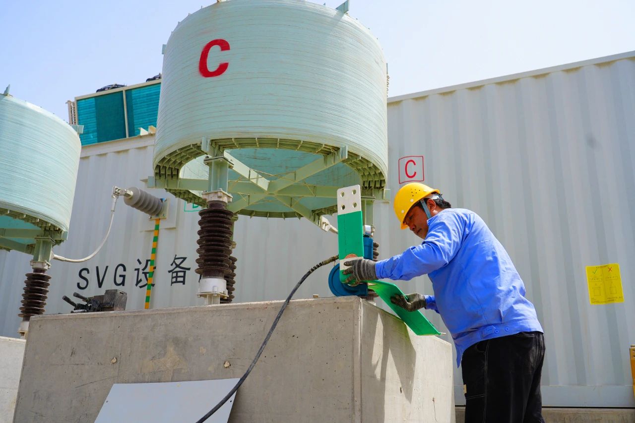 4月26日,中绿电若羌400万千瓦光伏项目2号220千伏升压站已全面完工,并具备并网发电条件。项目施工现场,工人们正忙碌地进行最后的调试和检查工作。