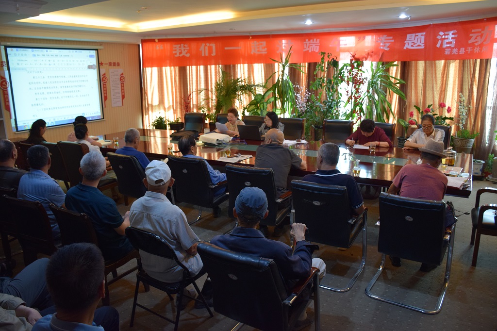 若羌县驻库尔勒干休所组织退休干部学习了党的创新理论《中共中央政治局召开会议习近平主持会议》;《中国共产党纪律处分条例》;书记讲党课《抓好党性、党风、党纪建设,推动全面从严治党取得新成效》;退休干部就学习《中国共产党纪律处分条例》作专题交流;观看微视频《端午故事》等活动。