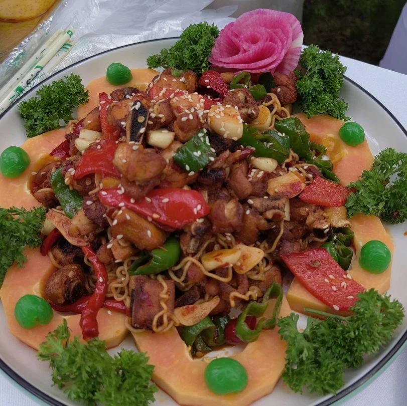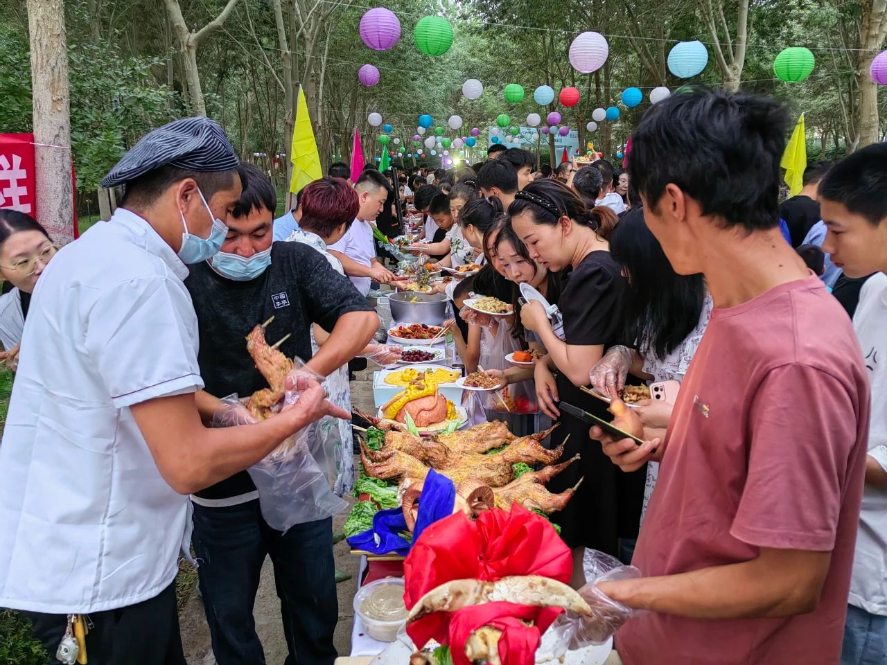 美食大赛现场,当地23家餐饮企业或特色小吃店大厨们汇聚在一起,大家纷纷拿出看家绝活,将各种食材烹制成54道新疆特色菜肴和若羌红枣美食。尤其是烤全羊、辣子鸡、抓饭、羊排、烤鱼等特色菜品的展出,整个现场香气四溢,吸引广大居民游客纷纷上前围观拍照、竞相品尝。
