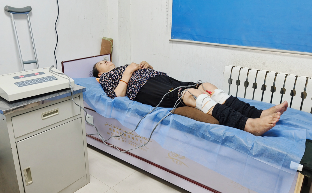 在卫生院中医馆理疗室内,村民斯马义·马木提正在准备接受针灸理疗,医生卷起他的裤脚,熟练地找准穴位,扎入短针,并打开理疗灯,进行针灸。