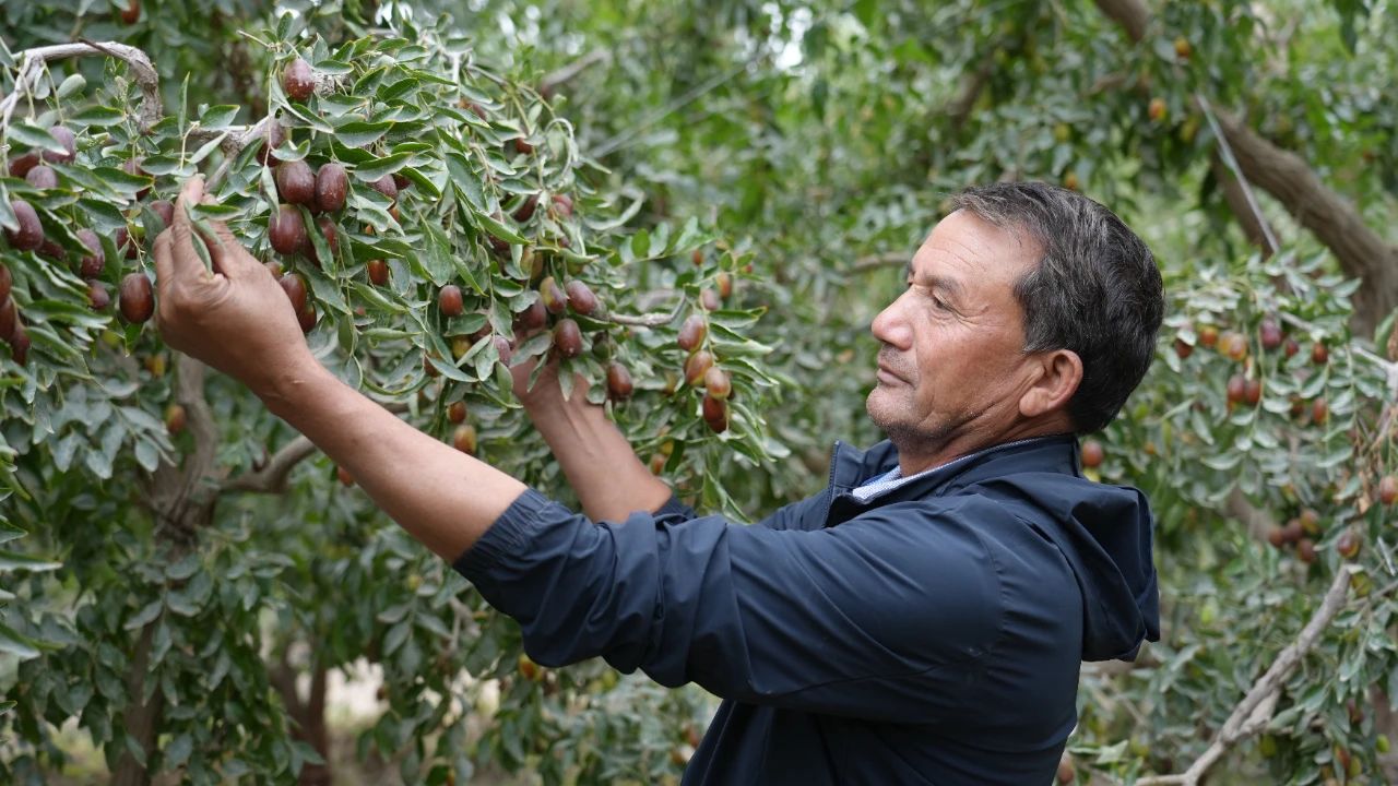 “我今年种了15亩的红枣,今年的红枣不仅产量好,而且又大又甜,现在是‘上糖期’,看着红枣由青变红,我心里说不出的高兴,今年一定可以卖个好价钱!”艾力·吾加布拉高兴地说道。