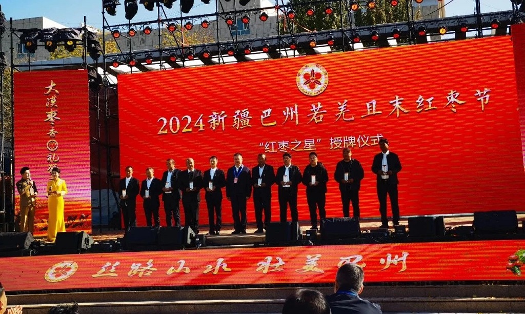 10月26日,“大漠枣香礼赞丰收”2024新疆巴州若羌且末红枣节在若羌县举行。活动上,新评选出的若羌且末20名“红枣之星”枣农满怀枣乡丰收的喜悦,带着甜蜜致富的向往,现场联名推介若羌且末红枣。