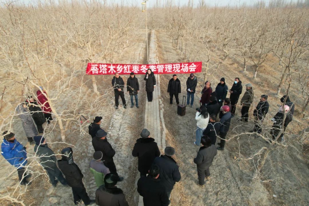1月2日,若羌县在吾塔木乡召开红枣冬季管理现场会。众多红枣种植户、农业专家以及相关技术人员齐聚一堂,相互交流冬季枣树修剪的技巧和经验。