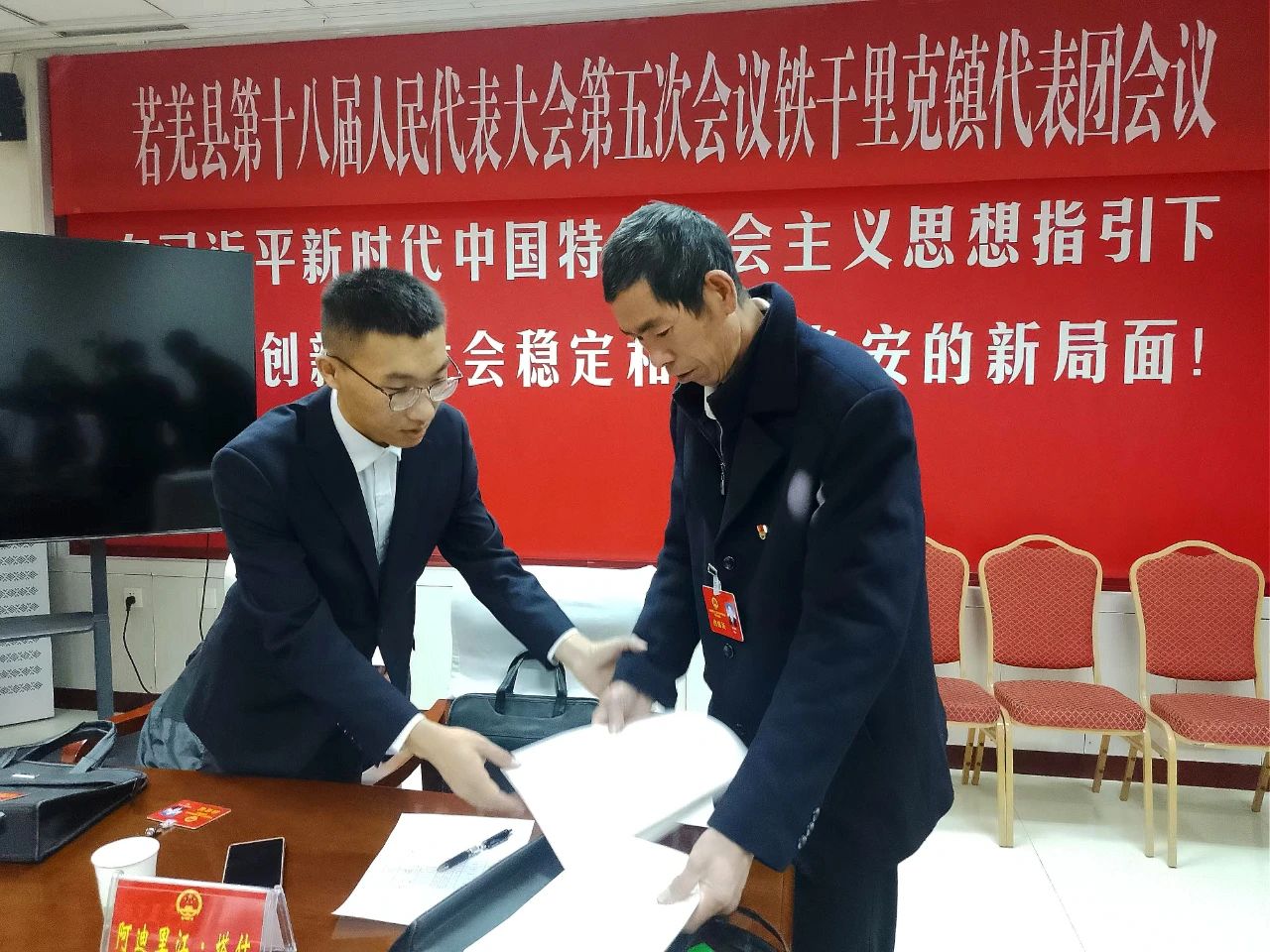 参加若羌县第十八届人民代表大会第五次会议的人大代表们正在领取会议材料。