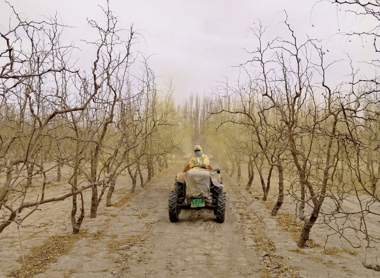 4月7日,在若羌县吾塔木乡、铁干里克镇的红枣地里一片忙碌景象。枣农们早早地来到自家枣地,调配好石硫合剂,操作着各类喷洒设备,对枣树进行细致地喷洒。石硫合剂均匀地覆盖在枣树的树枝、树干上,形成了一道抵御病虫害的“保护膜”。