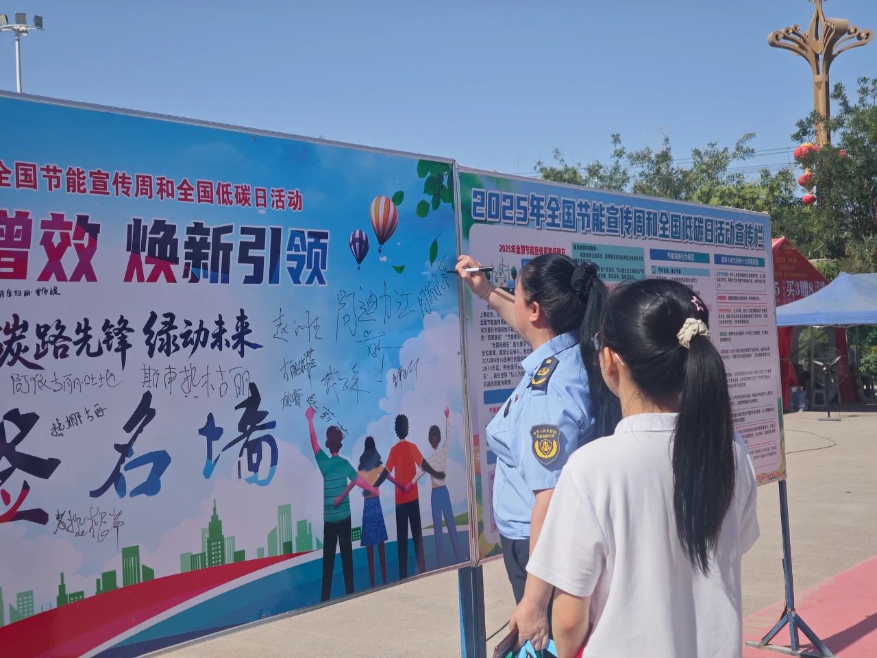 在主题签名墙处,广大干部群众纷纷在签名墙上签下自己的名字,以实际行动表明节能降碳的决心。活动还通过新能源汽车科普展示、开展节能降碳进机关、进社区、进校园、进医院、进企业等来进一步扩大宣传覆盖面。