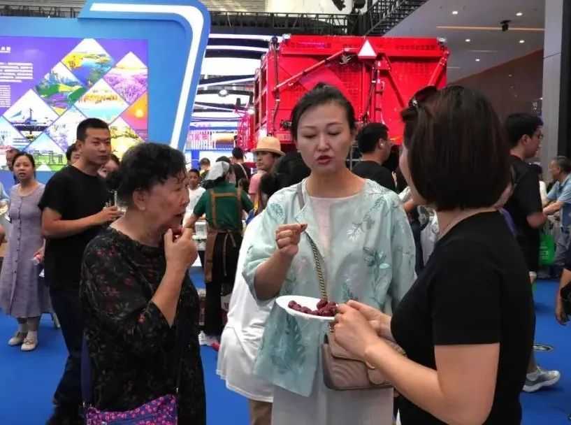 6月28日,2025(中国)亚欧商品贸易博览会若羌县招商引资专场推介现场人潮涌动,若羌县特色农产品吸引了众多客商纷纷驻足品尝并咨询。