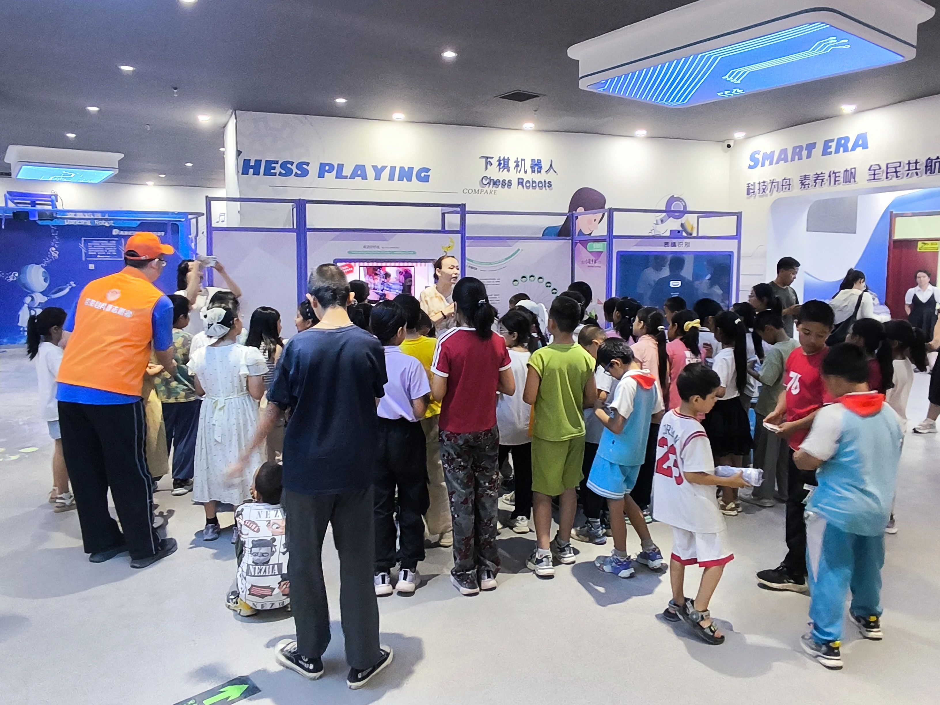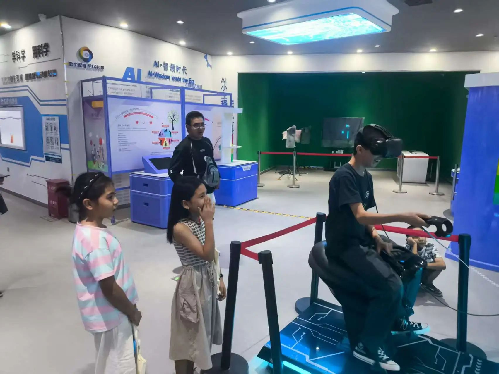 各种先进的科学实验和作品展示,寓教于乐,让学生身临其境,感受到了科技的魅力和力量。孩子们依次参观了“基础科学”“智慧生活”“生态环保”等主题展区,在“AI智领时代”前,小朋友们排队体验人工智能带来的神奇效果;“VR虚拟现实”体验更是让孩子们兴奋不已;“航天探秘”展区,孩子们围着火箭模型热烈讨论。他们徜徉在科学知识的海洋里,流连忘返,对于各种新奇的体验设备跃跃欲试,发出阵阵惊叹,相互探讨分享着此行所得。