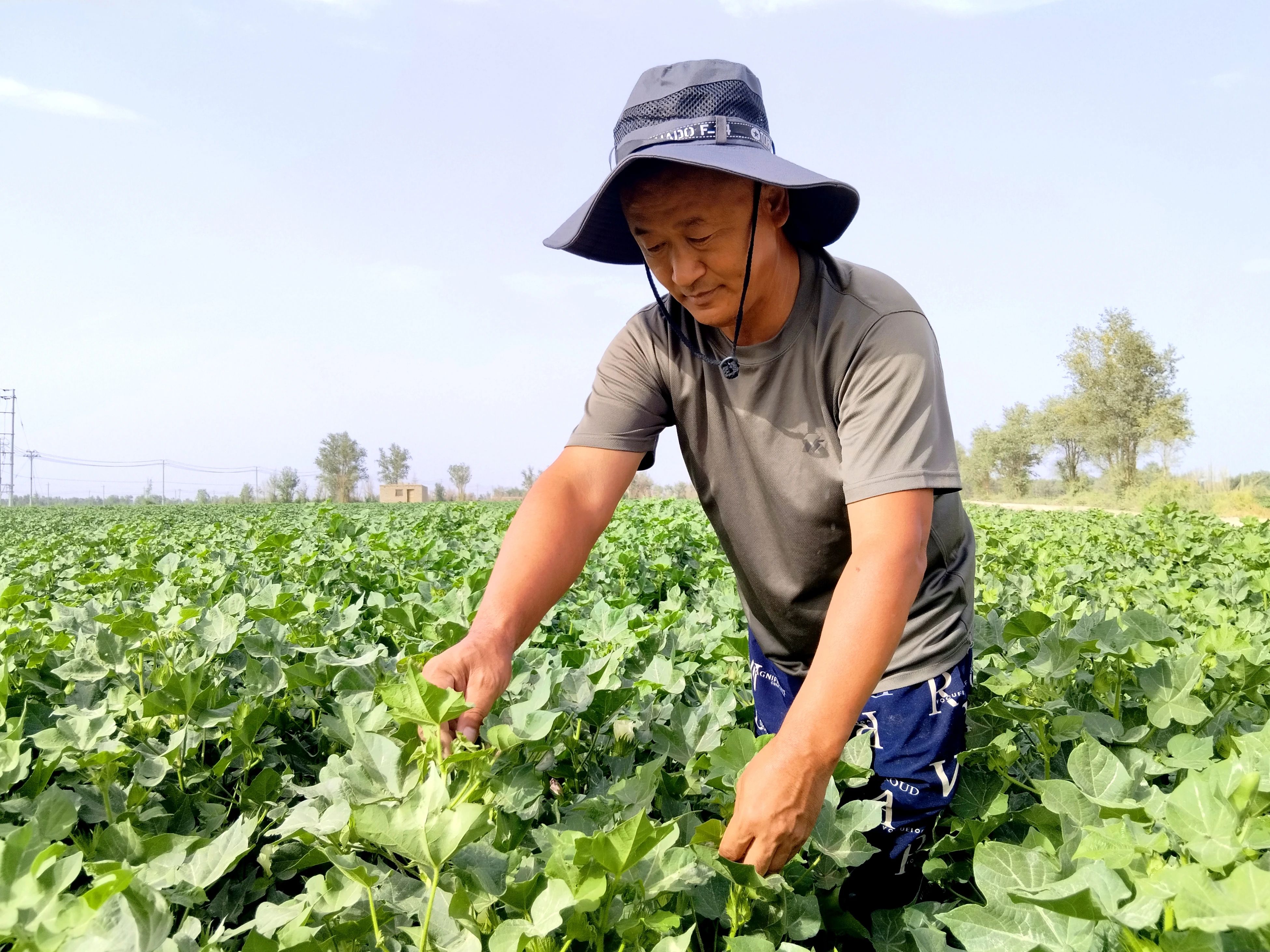 7月15日,走进若羌县铁干里克镇努尔巴格村的棉田,映入眼帘的是一片生机勃勃的绿色海洋。棉花植株茁壮成长,展现出一派喜人的景象。种植户李云峰和村干部一起在棉田里查看棉桃坐果和虫害情况。