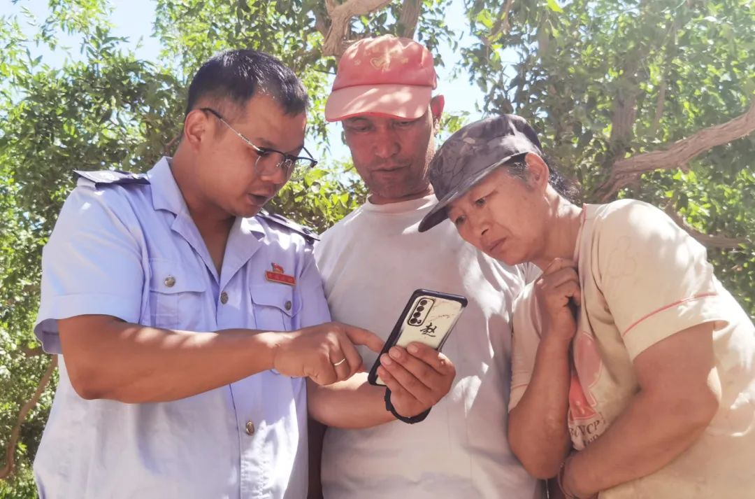 7月15日,国家税务总局若羌县税务局干部在瓦石峡镇给农牧民群众讲解农用地租金线上办理的模式和缴纳方式。吴姗姗摄