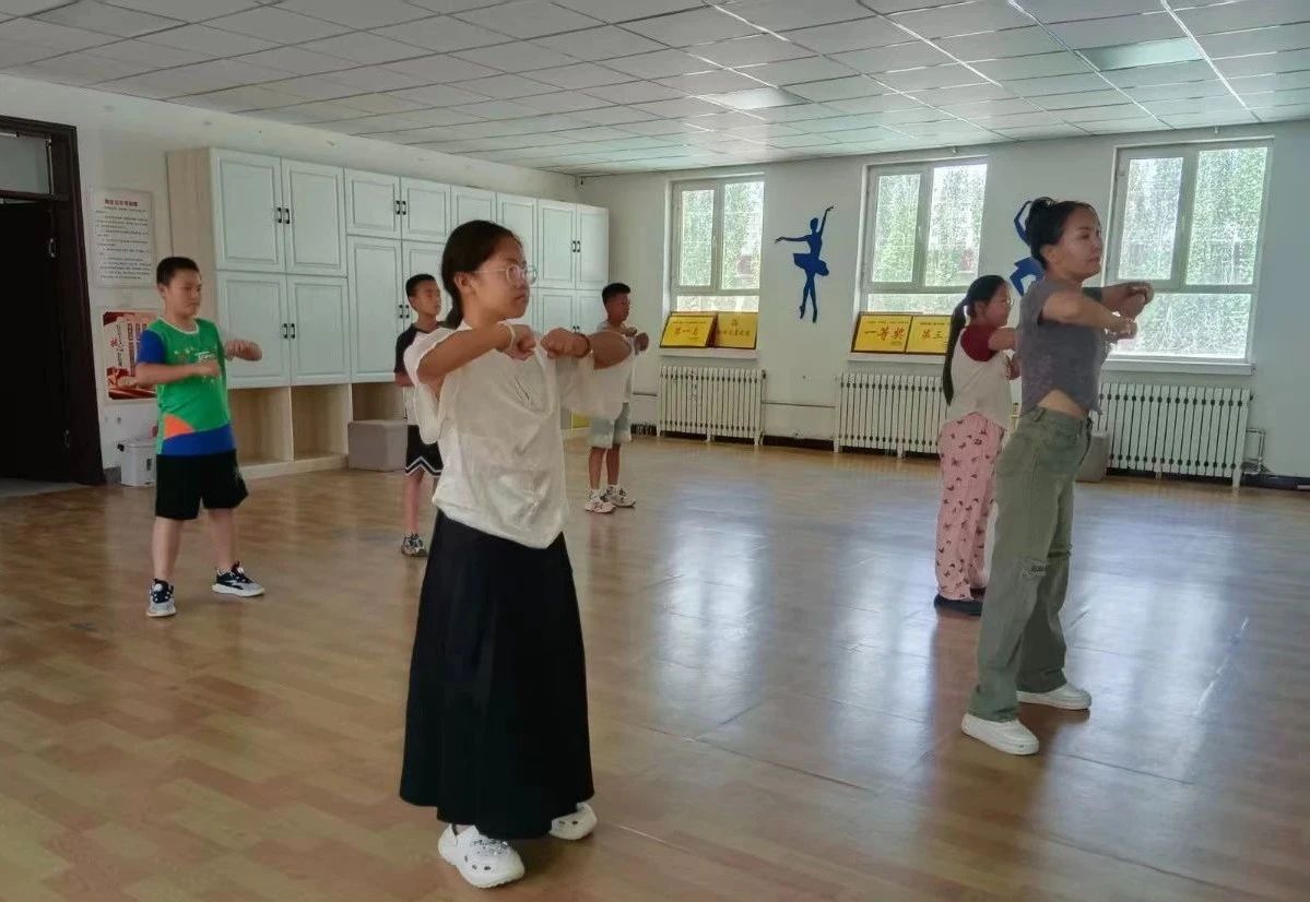 7月4日,在若羌镇文化社区新时代文明实践站内,绘画与舞蹈课正在同步进行,舞蹈课上,学生伴随着音乐的节奏认真学习着每一个舞蹈动作,老师在领着大家跳舞的同时,不时进行动作指导。