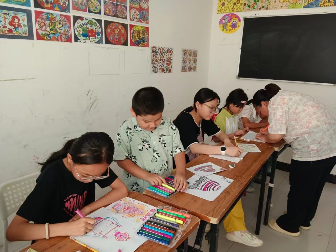 与热闹的舞蹈课不同,绘画课的同学们都安安静静地画着心中的图案,老师拿着彩笔不时为孩子们指导线条和色彩搭配。
