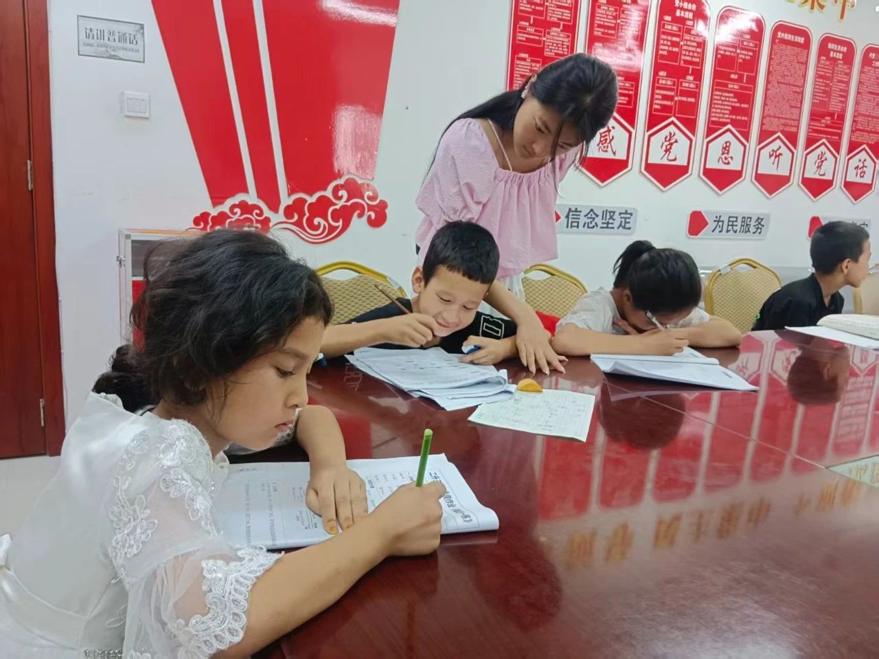 在若羌县吾塔木乡尤勒滚艾日克村新时代文明实践站内,老师正在为孩子们答疑解惑,引导孩子们认真思考、积极交流。