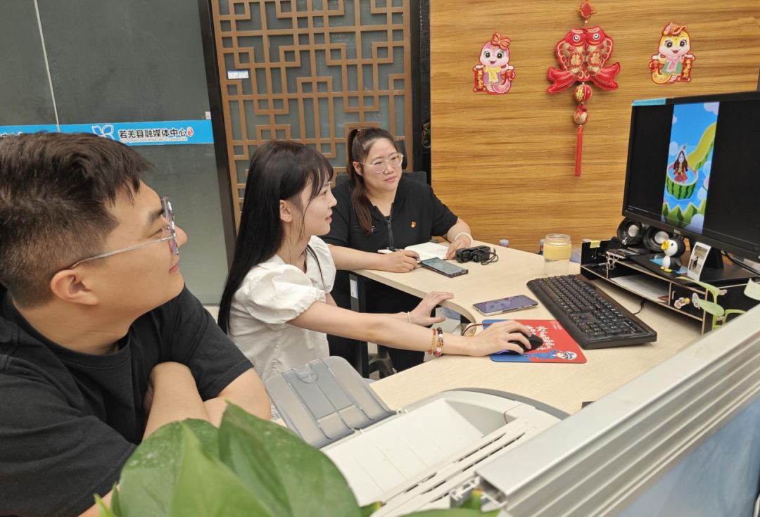 若羌县融媒体中心党支部以“融心向党媒美与共”党建品牌为引领,以镜头为眼、以笔尖为锋,全方位传播若羌声音、讲述若羌故事。图为7月4日晚,该中心的编辑们在一起探讨AI技术在短视频上的应用。郭城摄