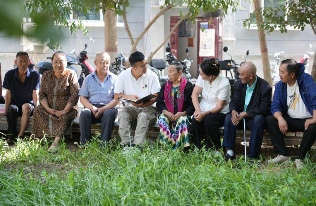 若羌县若羌镇胜利社区积极探索“一老一小”融合服务新模式,推进城镇社区公共服务设施品质提升。图为7月3日,社区党总支书记汪志忠(左四)和社区干部一起征求辖区老年人对推进社区“一老一小”配套设施建设的意见。郭城摄