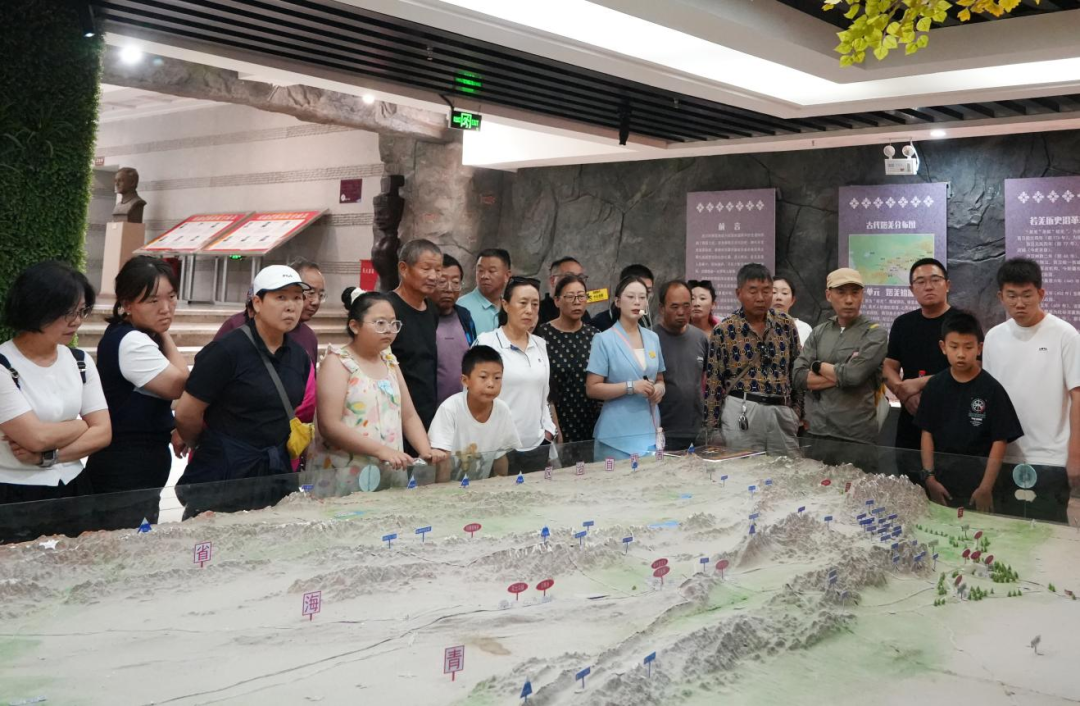 若羌县楼兰博物馆讲解员结合若羌县地形地貌沙盘,给游客讲解县域内古迹遗址分布情况。郭城 摄