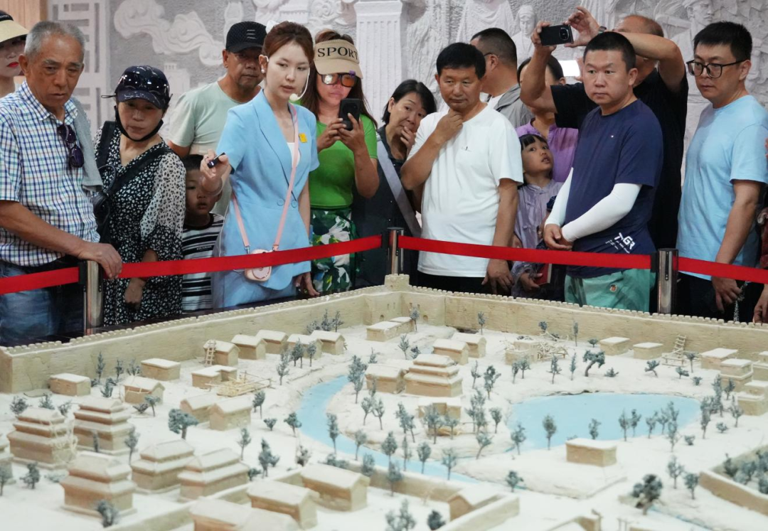 9月10日,若羌县楼兰博物馆讲解员在楼兰故城复原模型旁,给游客讲述各民族广泛交往交流交融,共同创造灿烂的中华文化的史实。郭城 摄