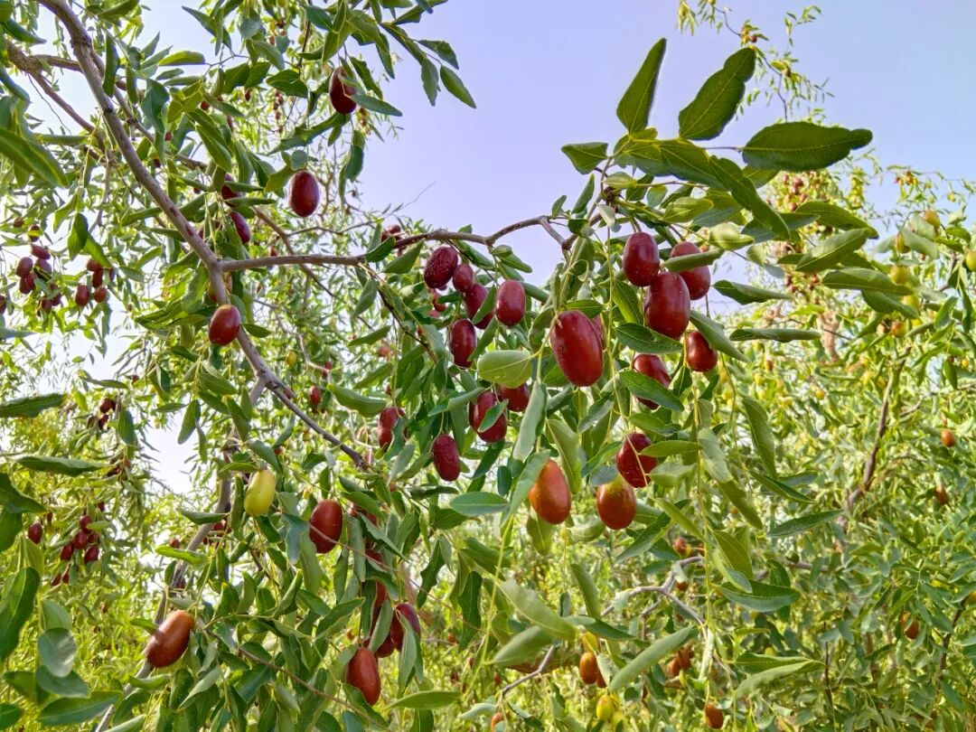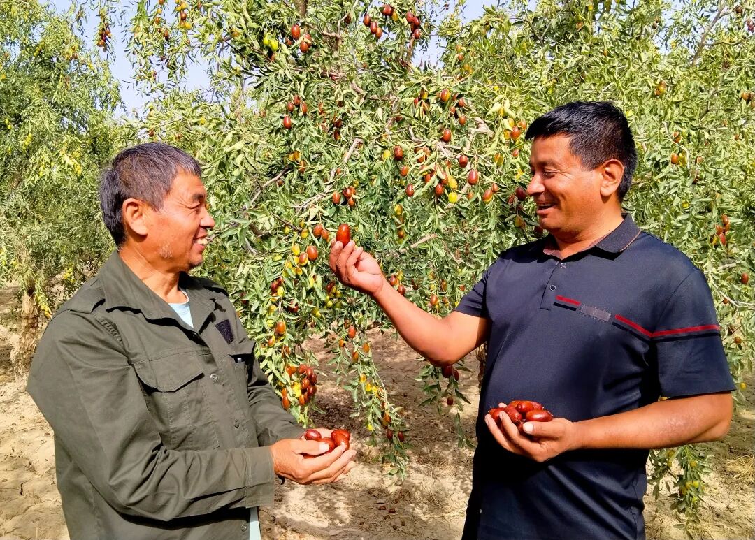 9月10日,在若羌县吾塔木乡尤勒滚艾日克村红枣园,成串的红枣裹上了红色外衣,果肉饱满,压弯枝头,一派丰收在望的景象。村民们正忙着清园、撑枝等,全力保障红枣品质与产量。