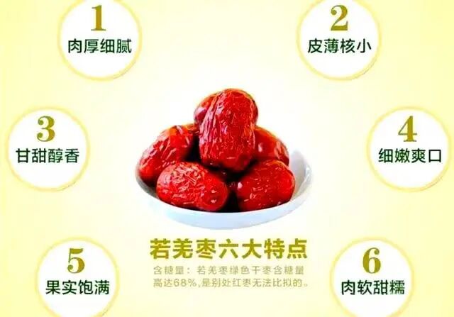 与其他地方红枣相比,若羌红枣不裂果、不生虫、耐储存,干枣含糖量高达68%,这也是别处红枣无法比拟的优势。