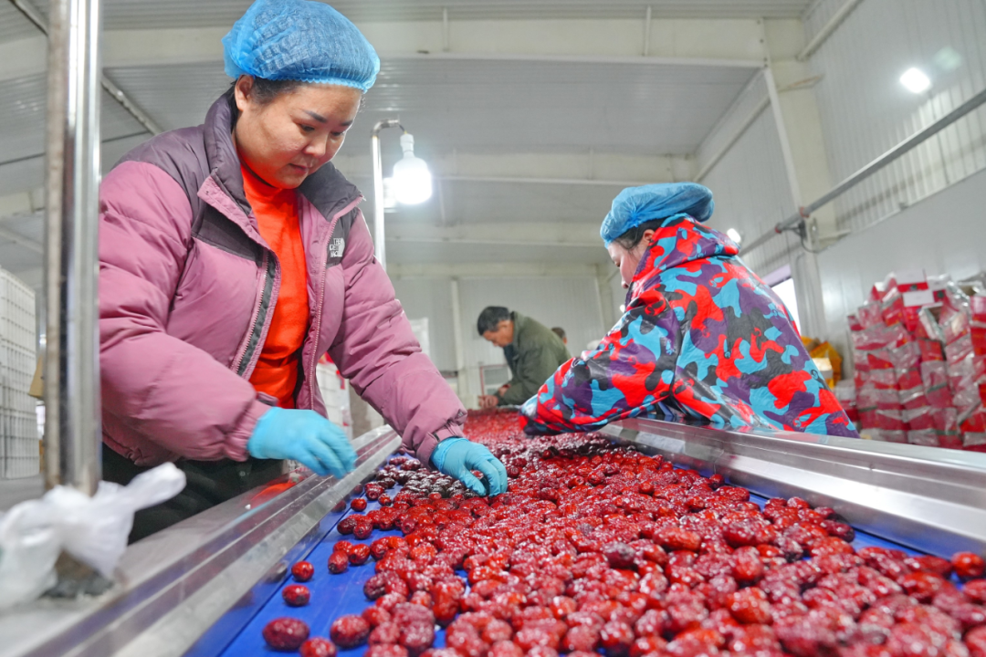 企业的发展还带动了当地红枣销售和村民就业。该公司每年收购近千吨红枣用于深加工,安置了当地50多人就业,红枣收购季节临时用工达200余人,每年人工费支出150余万元。图片