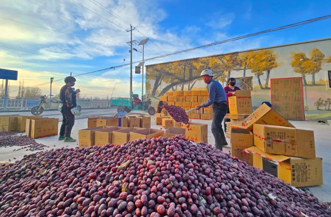 2024年11月6日,若羌县吾塔木乡尤勒滚艾日克村的枣农们正在将晾晒好的红枣进行集中装箱。苏波 摄