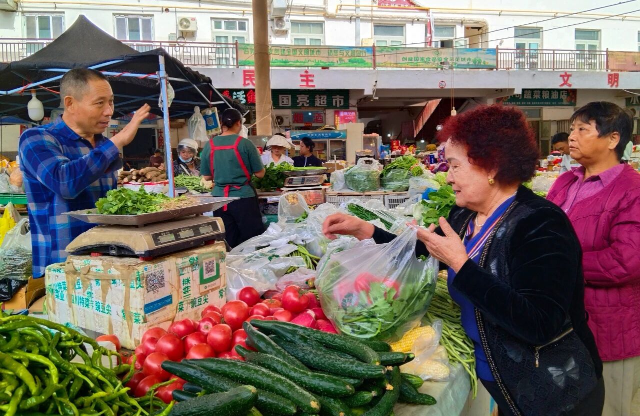 正在挑选水果的岳玉梅手里拿着满满的食材,脸上满是笑意地说:“这几年我们的生活越来越好,住上了新房子,市场里的物资越来越丰富,日子过得有滋有味。真心祝福我们的祖国繁荣昌盛,以后的日子更加红火!”