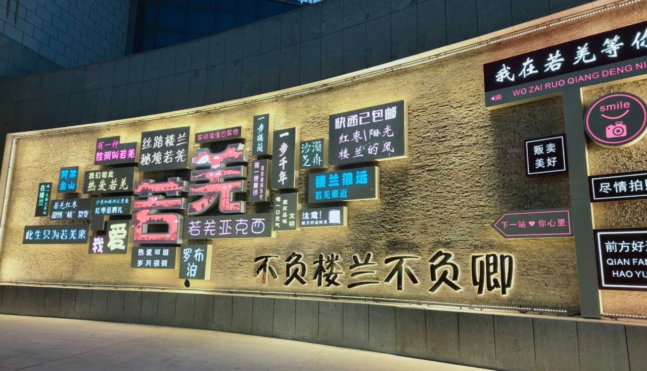 近日,新疆若羌县楼兰影剧院周边,一面融合历史文化与潮流元素的网红打卡墙正式亮相,迅速成为当地文旅新地标。每当夜幕降临,这里霓虹闪烁、标语灵动,吸引大批游客和居民前来打卡,在光影交错间沉浸式感受丝路楼兰的独特魅力。