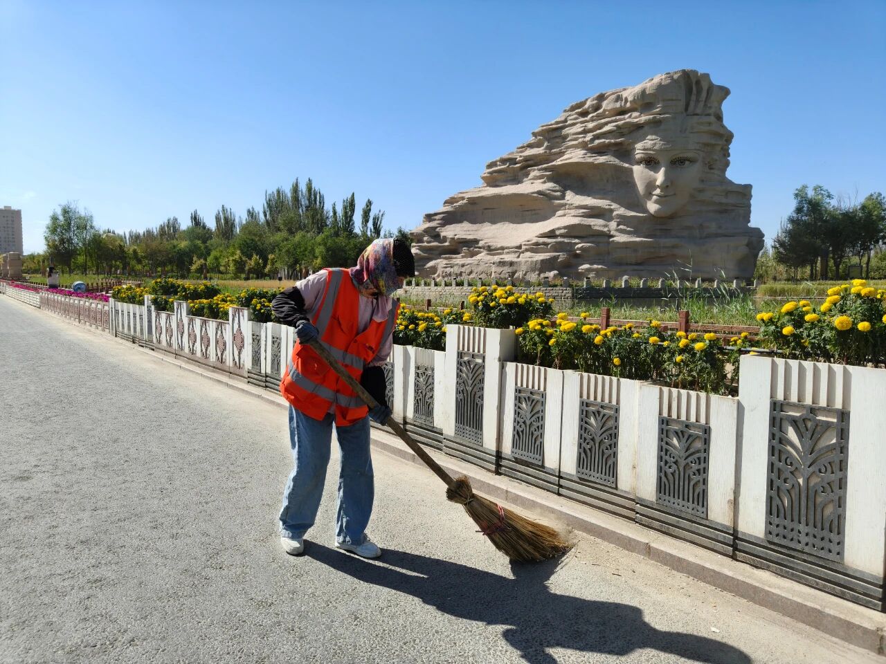 在若羌县各个路段,像艾姆拉·罕孜这样的环卫工人还有近百名。他们分成早、晚两个班次,实行“片区负责”保洁模式,确保国庆期间城区主次干道、公园广场、商圈周边等重点区域垃圾“日产日清、随产随清”。