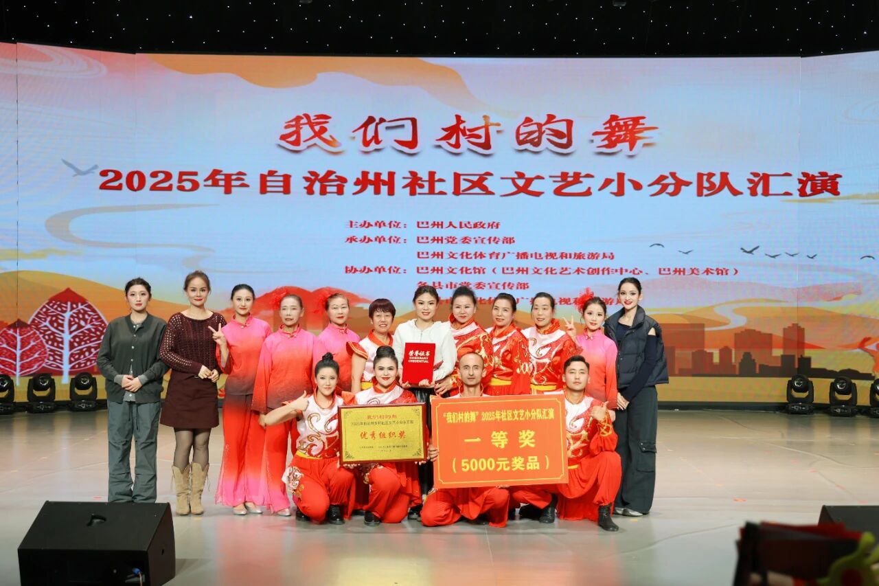 11月28日,“我们村的舞”2025年巴音郭楞蒙古自治州乡村社区文艺小分队(社区组)汇演在库尔勒市融媒体中心精彩上演。来自全州各县市的9支优秀文艺小分队同台竞艺,若羌县代表队选送的舞蹈《红韵·丰收情》凭借亮眼表现斩获一等奖。