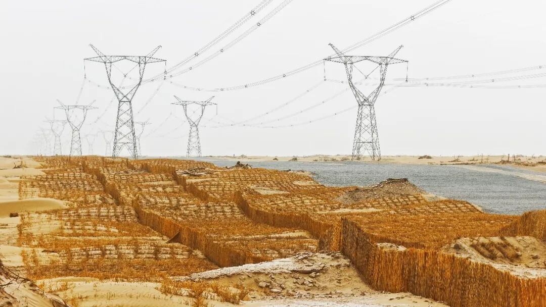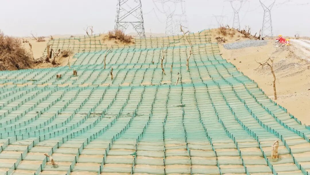 3月15日,在新疆“疆电外送”第四通道电源项目新能源部分生态治沙工程现场,218国道沿线两侧连绵起伏的沙丘上,纵横交错的万亩草方格如巨网铺展,牢牢锁住流沙,在大漠戈壁间勾勒出一道守护生态的坚实屏障。