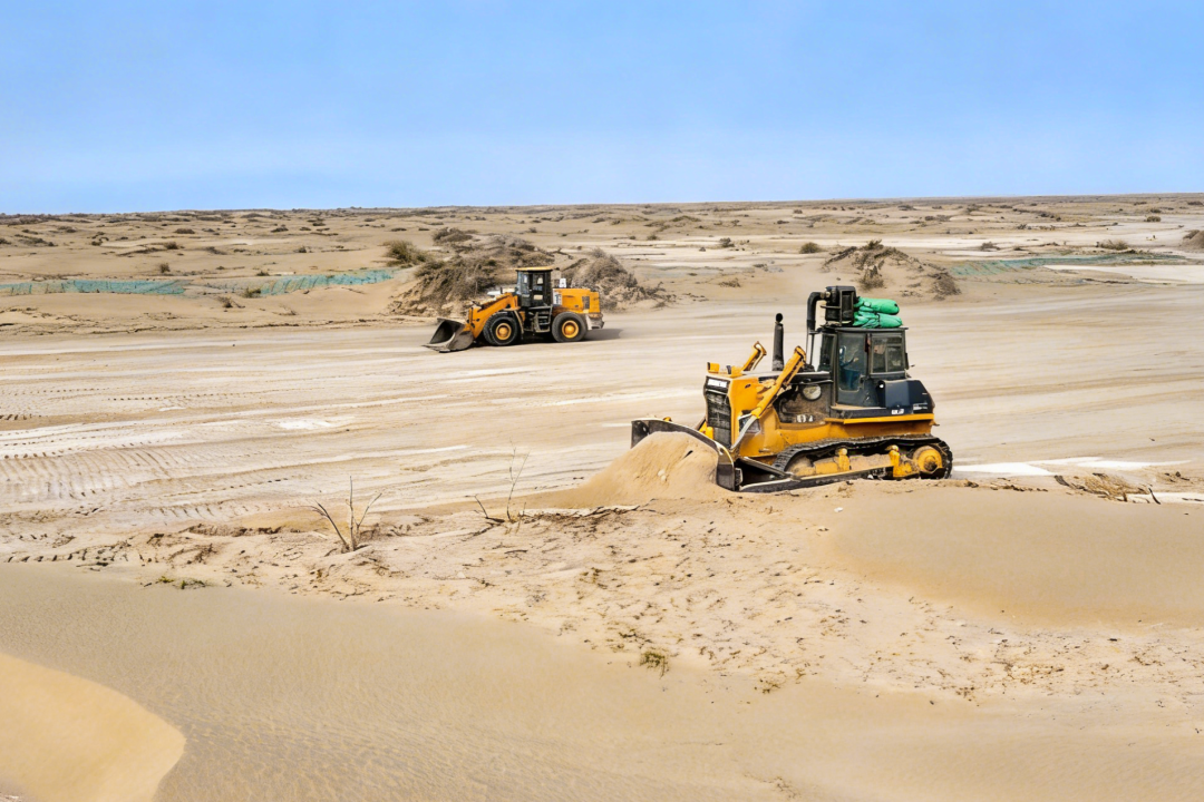 据三峡若羌公司新能源建管中心副主任刘鑫介绍,项目自2025年7月底开工,计划今年全部交付。目前工程进展顺利,已完成芦苇低立式沙障700余亩、HDPE网低立式沙障1200余亩、高立式沙障28000余米、砾石输沙带28000余立方米。经现场监测,初步形成的立体防沙体系已有效遏制风沙对FG2道路及周边新能源设施的侵蚀威胁。后续项目团队将根据不同区域的风沙活动特点,优化治沙措施组合方式,同步建立长期监测机制,持续跟踪生态修复效果,为新疆新能源基地的稳定运行筑牢生态屏障。