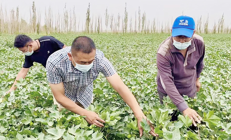 8月2日,在若羌县铁干里克镇努尔巴格村的棉花种植基地,种植户邢杰(右一)和村干部一起查看棉桃坐果情况。(通讯员董帅龙摄)