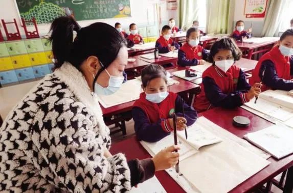 3月15日,在若羌县第二小学四年级的书法课上,教师李宁宁正在教学生如何握笔、落笔
