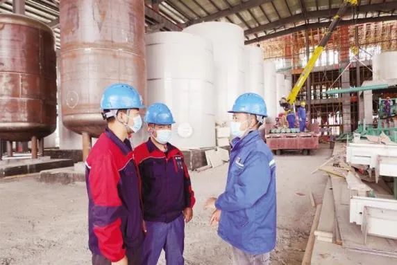 3月15日,在志存锂业集团新疆志存新能源材料有限公司车间里,穆拉提·穆萨(左)、仁青闹热(右)正在商量优化设备吊装方案