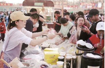 夜市开张了,村民来助兴。喝啤酒大赛、乡村歌舞表演……该乡网红主播小麦、西部大学生志愿者杨帅当起了主持人。合唱、独舞、广场舞……14个节目轮番上场。美食、叫好声、彩灯、烟火气,让夜市人气爆满。