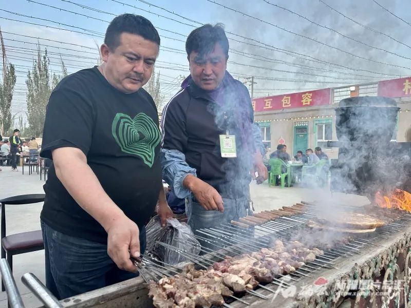 7月12日傍晚,若羌县吾塔木乡果勒艾日克村村民库尔班·麦麦提(右)正在烤羊肉串。董帅龙摄