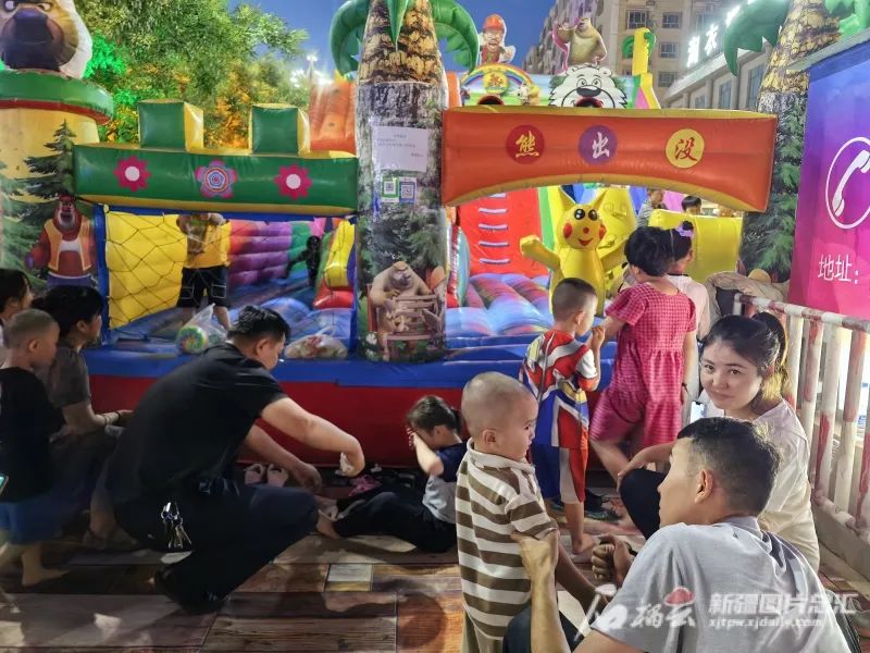 艾合买提·艾买尔日常靠制作冰糕、经营儿童娱乐设施为业。夜市开设地摊市场后,他便把业务拓展过来,摆放了一座孩子玩的淘气堡。