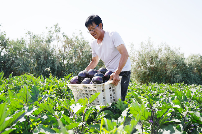 近日,在若羌县瓦石峡镇吐格曼塔什萨依村,菜农在采摘茄子。(通讯员苏波摄)