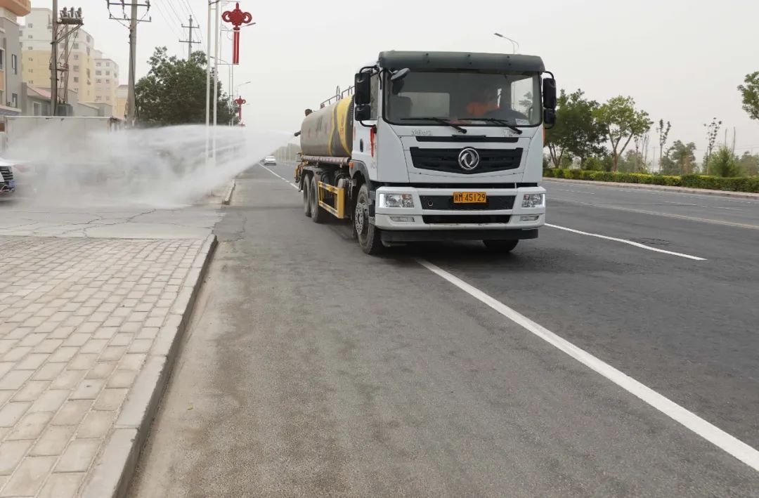 6月15日,若羌出现高温天气,启迪城服若羌玉洁环卫工程有限公司多功能洒水车在洒水降温。