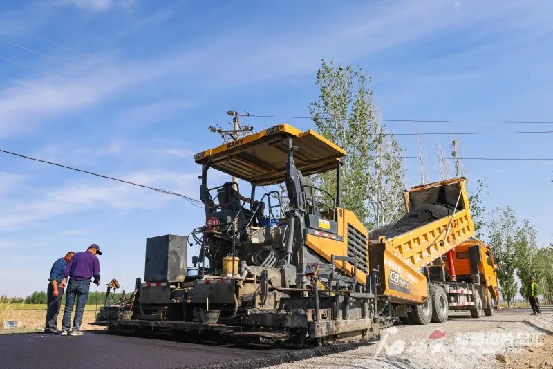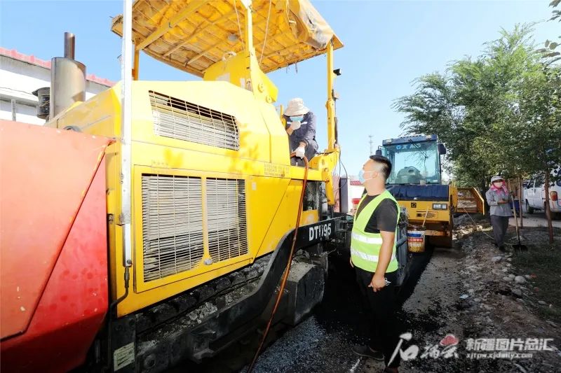 5月10日,博乐市小营盘镇呼和布热村新建的农村公路上,建设者驾驶沥青摊铺机在施工作业。于苏甫·艾尼摄