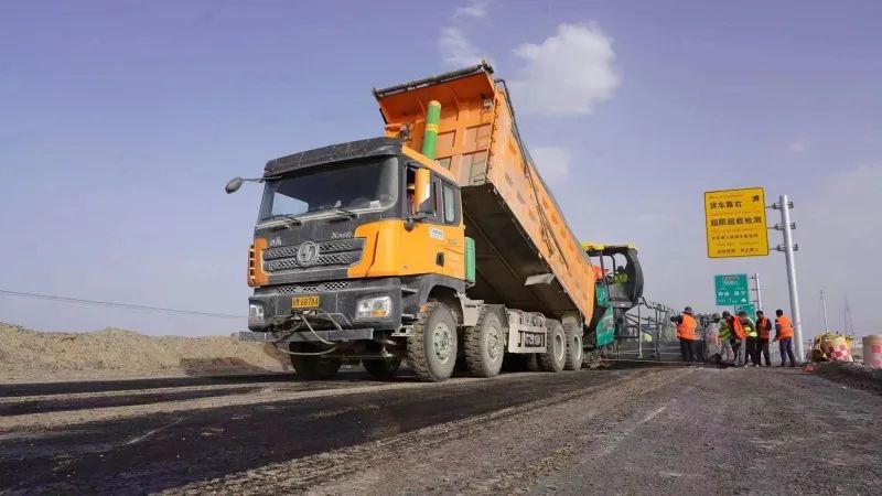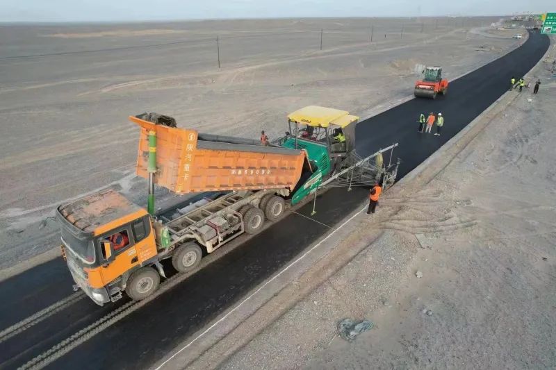 该项目地处罗布泊无人区,夏季高温酷暑,室外温度可达50℃以上,地表温度70℃,环境极端恶劣,风沙肆虐,无水无电无网。建设者克服高温、干燥、施工环境恶劣等重重困难,历经数月艰辛奋斗,完成路面摊铺任务。