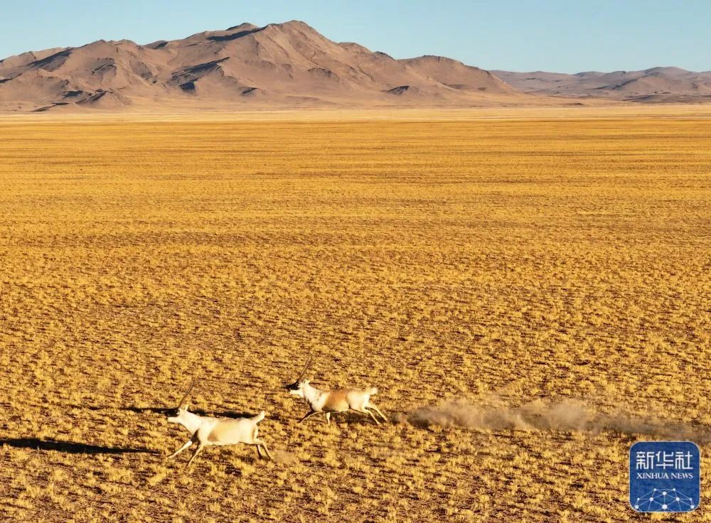 ↑阿尔金山国家级自然保护区,两只公藏羚在寻找母藏羚(无人机照片,12月18日摄)。