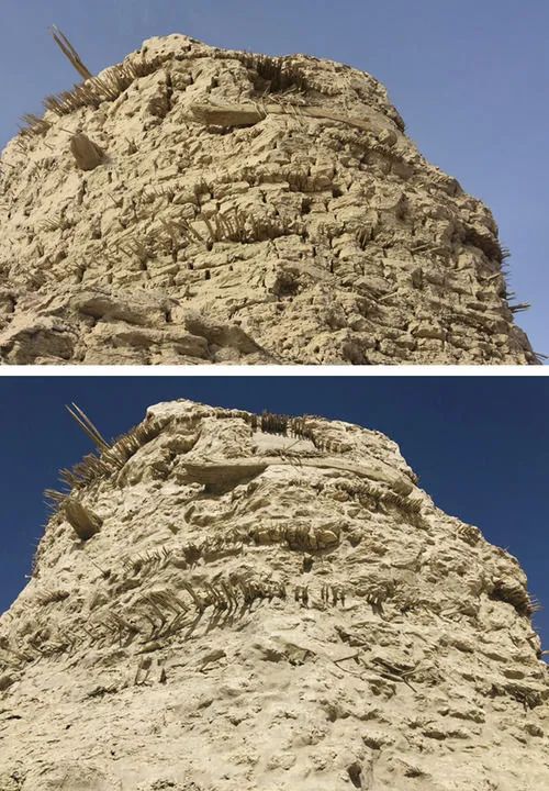 这是一张拼版照片,上图为抢险加固前的佛塔遗址局部(2019年11月14日摄);下图为抢险加固后的佛塔遗址局部(2020年10月20日摄)。新华社发(中铁西北科学研究院有限公司供图)