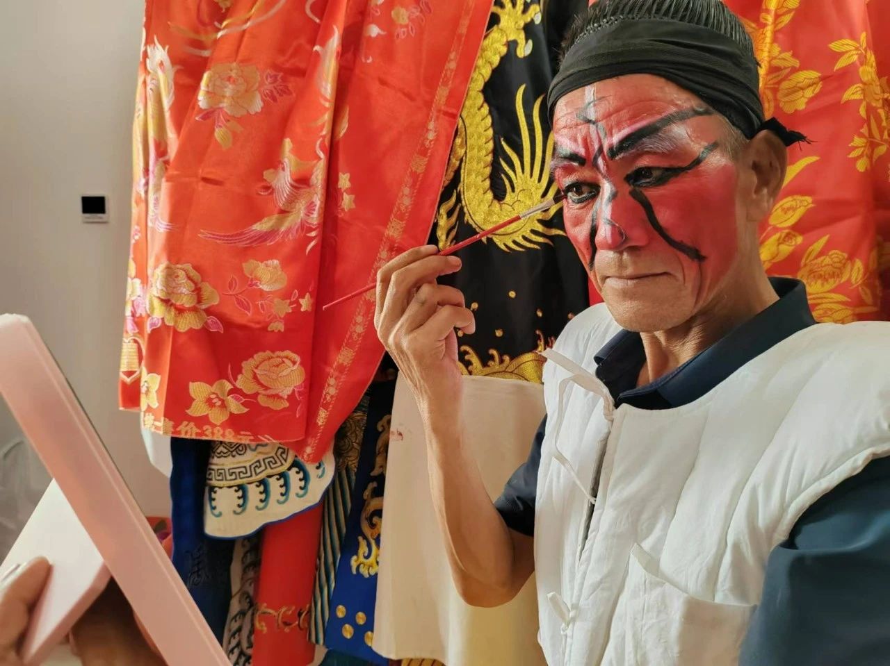 后台,仇银粮对着镜子,往自己的脸上勾画脸谱。过会儿,他要带妆表演秦腔传统选段《下河东·赶驾》。