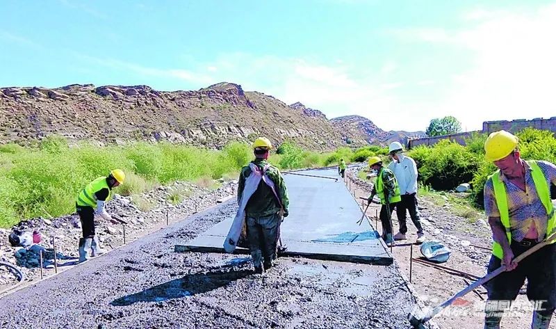 6月5日,在拜城县铁热克镇铁热克村农村公路建设现场,工人们在有条不紊地施工。刘红文摄