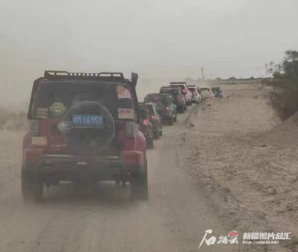 6月11日,从若羌阿拉干自驾车营地出发的沙漠越野车队。石榴云/新疆日报记者任江摄