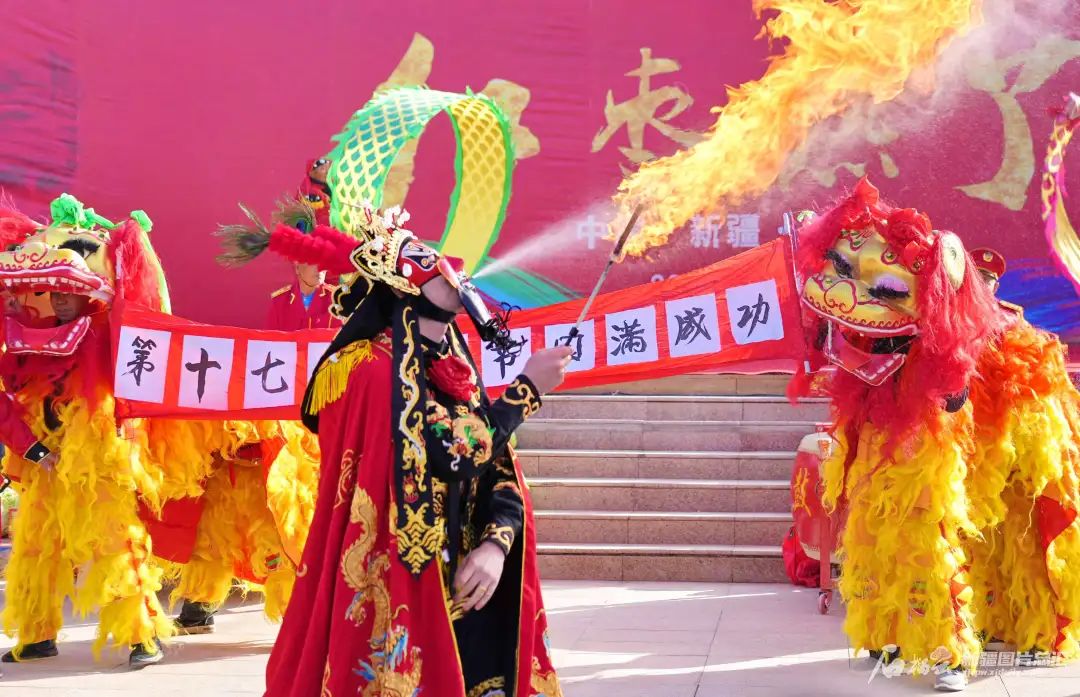 2023年11月,阿力木江·库尔班在巴音郭楞蒙古自治州若羌县第十七届“楼兰文化·红枣节”活动上表演吐火。(摄影:苏波)